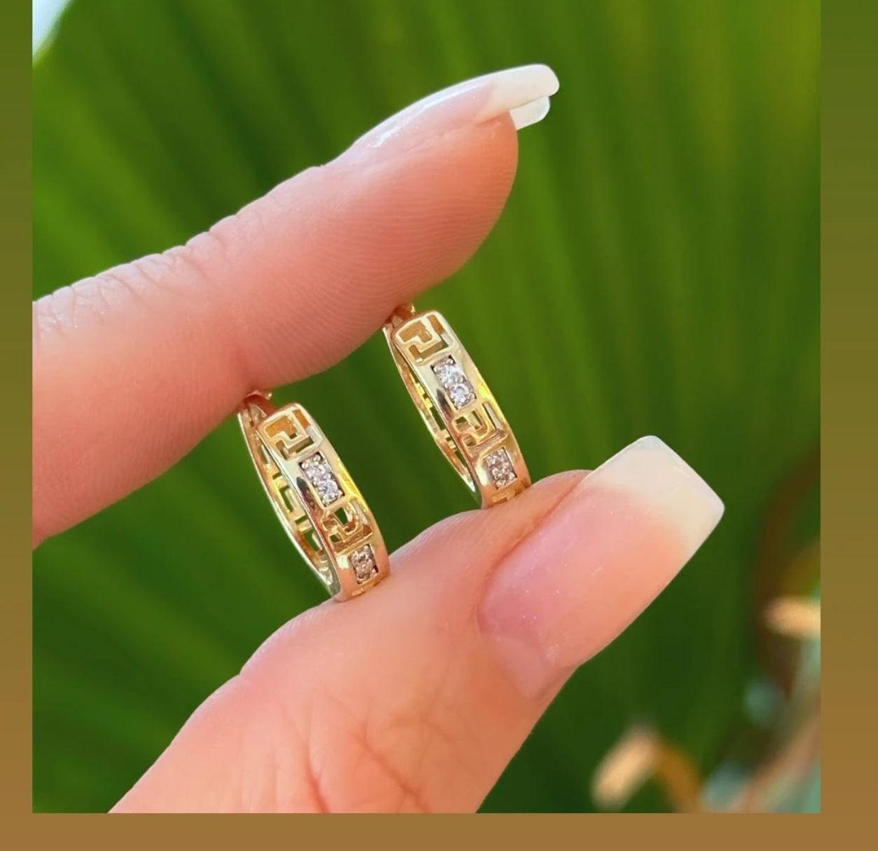 A small hoop earring with a unique, delicate, and chic design might feature an intricate pattern or texture that sets it apart from classic hoops. Its small size lends to a sense of understated elegance, while the distinct design could include elements such as twisted metal, milgrain detailing, or even miniature cut-outs. The hoop may have a slender profile, and its surface could be finished with a high polish or a matte sheen, potentially accented with tiny gemstones or enamel for a subtle touch of glamour. This earring would be perfect for those who appreciate jewelry that combines everyday wearability with exclusive design touches that convey sophistication.